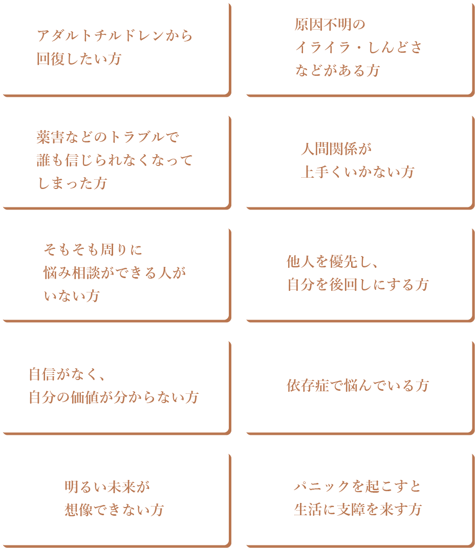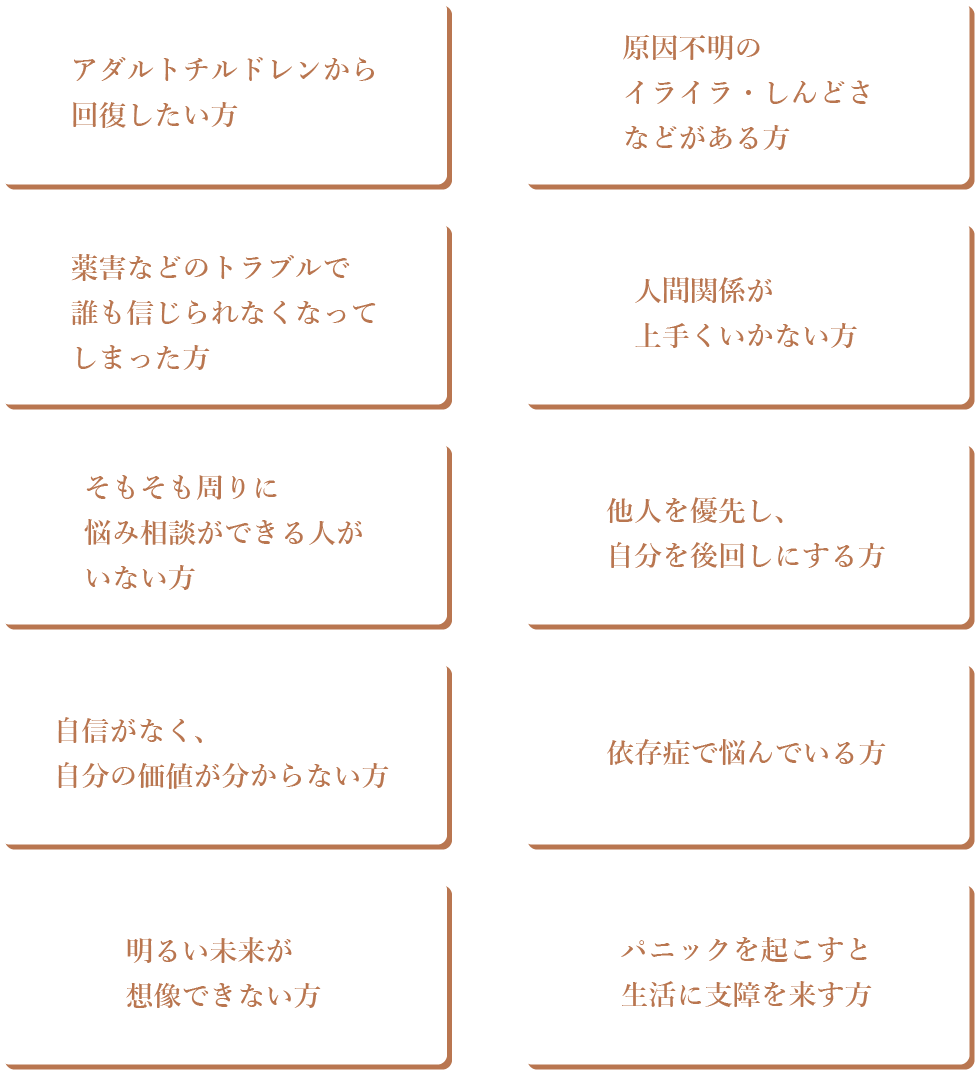 人間関係、薬害や原因不明の不調、アダルトチルドレン…